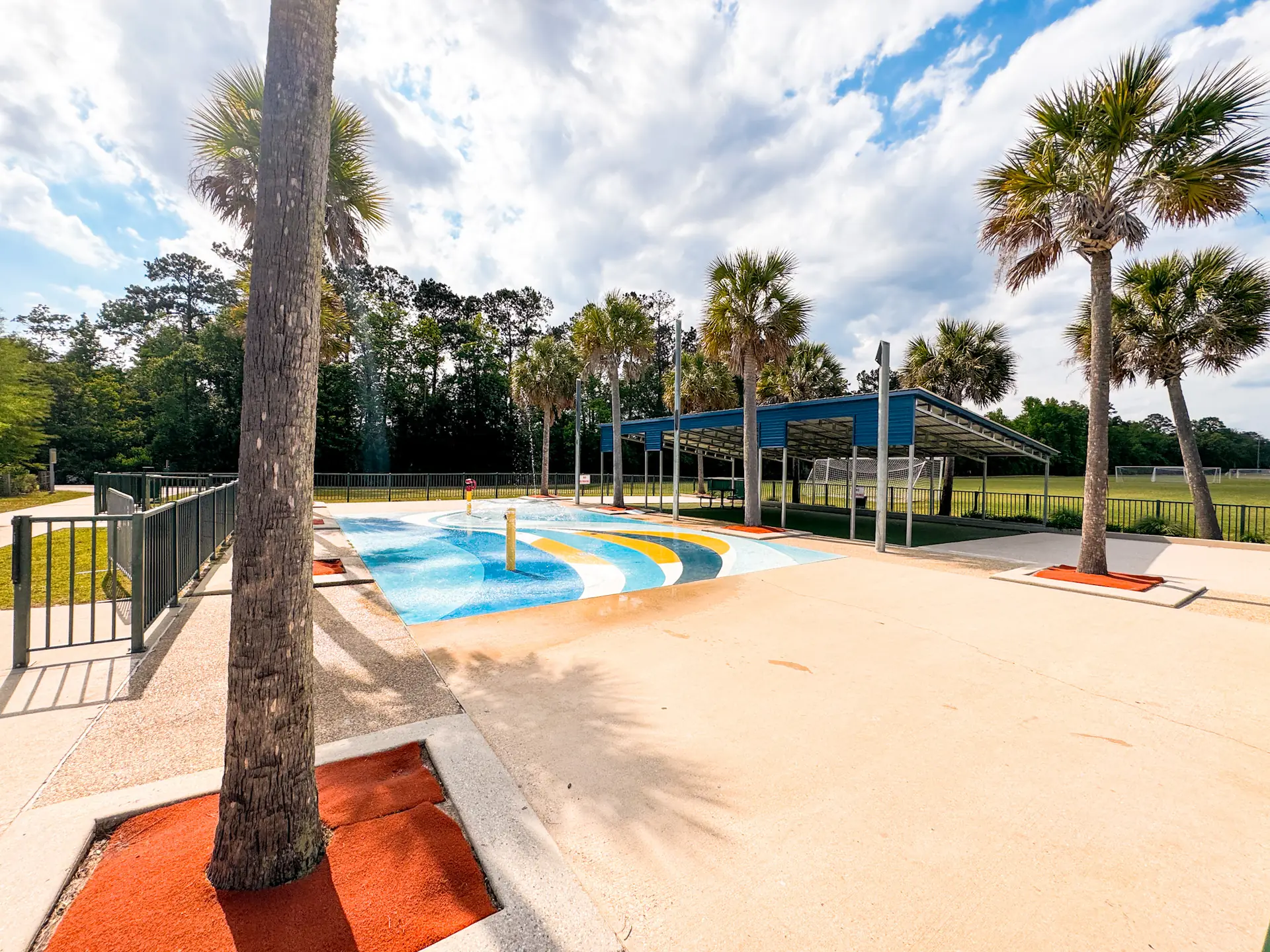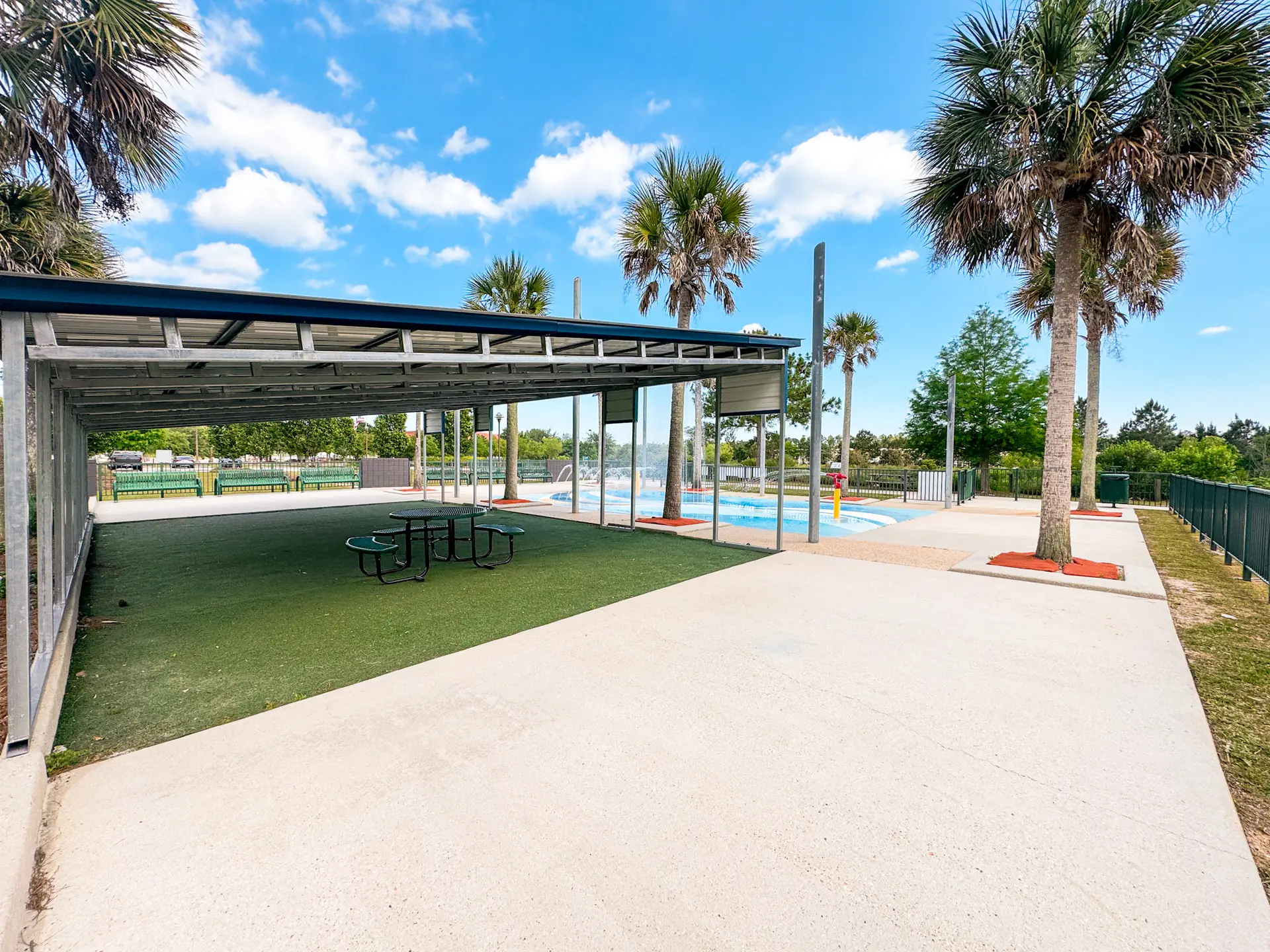 Get ready to beat the heat at our exciting splash pad area! It features a spacious shade structure, measuring 24'W x 40'L. Plus, enjoy a break with family and friends around one of our two picnic tables, conveniently located within the area with wheelchair accessibility. And, just outside the fence, you'll find a cozy wooden picnic table perfect for staying dry while you're relaxing and supervising little ones.